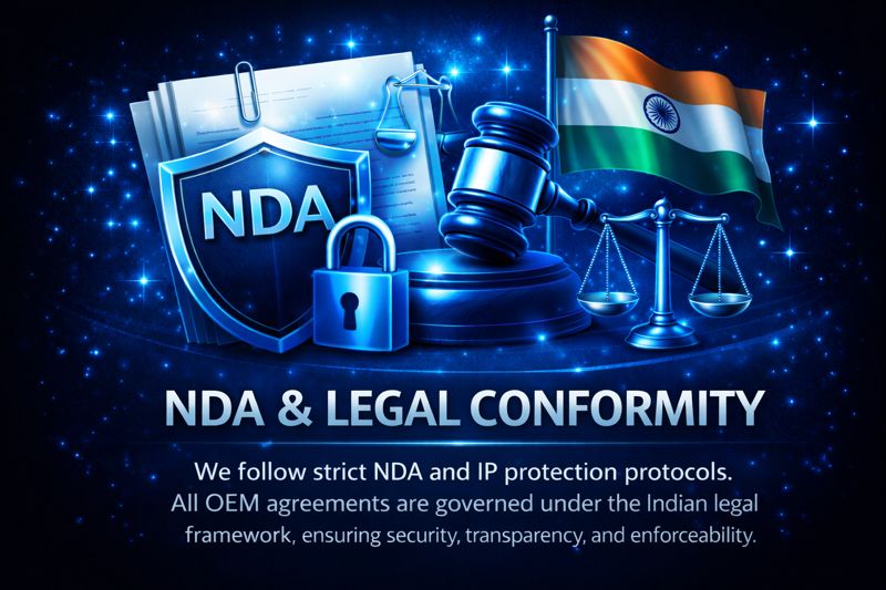 We follow strict NDA and IP protection protocols. All OEM agreements are governed under the Indian legal framework, ensuring security, transparency, and enforceability.